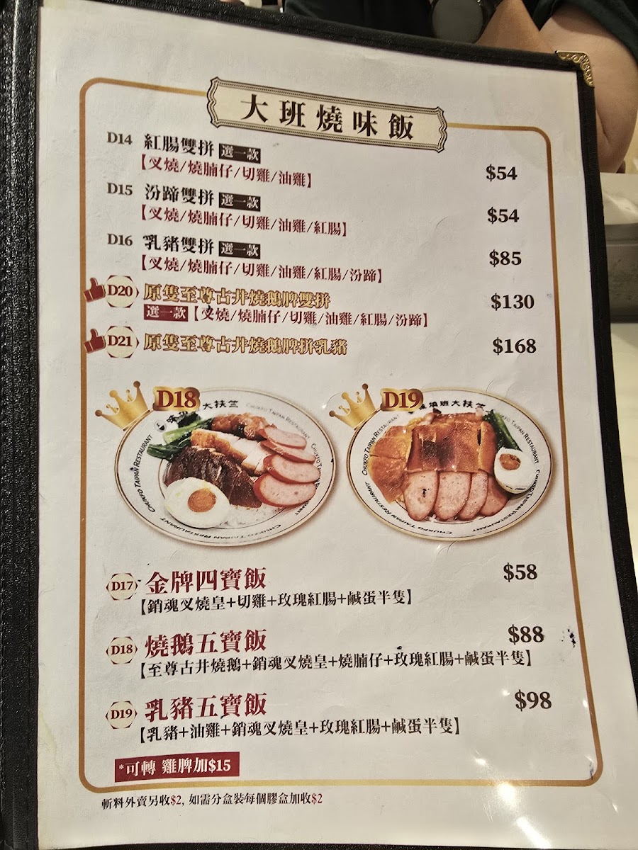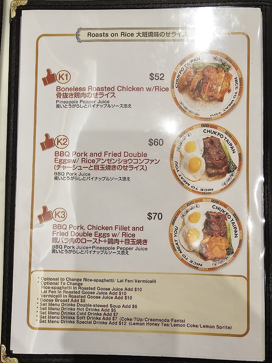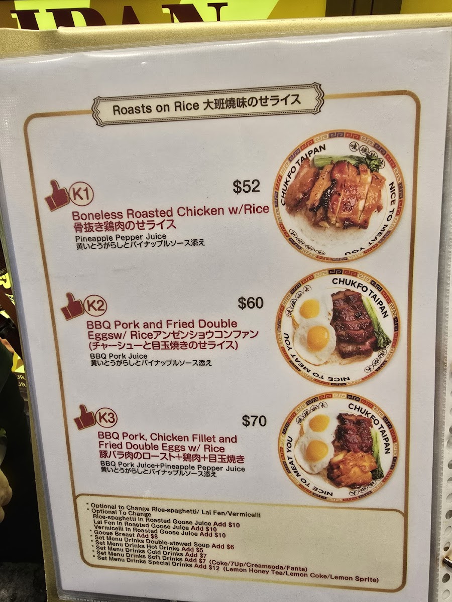 “ Chukfo Taipan is a very famous BBQ spot in Wan Chai. In fact, it is one of top rank spot all the time. There is always line up outside. We ordered BBQ pork with 2 eggs on rice, and roasted goose and soy chicken on rice. The cha siu is cut in thin slices, but we saw the cha siu is cut in thick slice on the other table. Maybe it depends on the chef. Roasted goose and soy chicken are both very tasty. Price range is between $60-$80 per person for lunch. Overall, highly recommended! ”