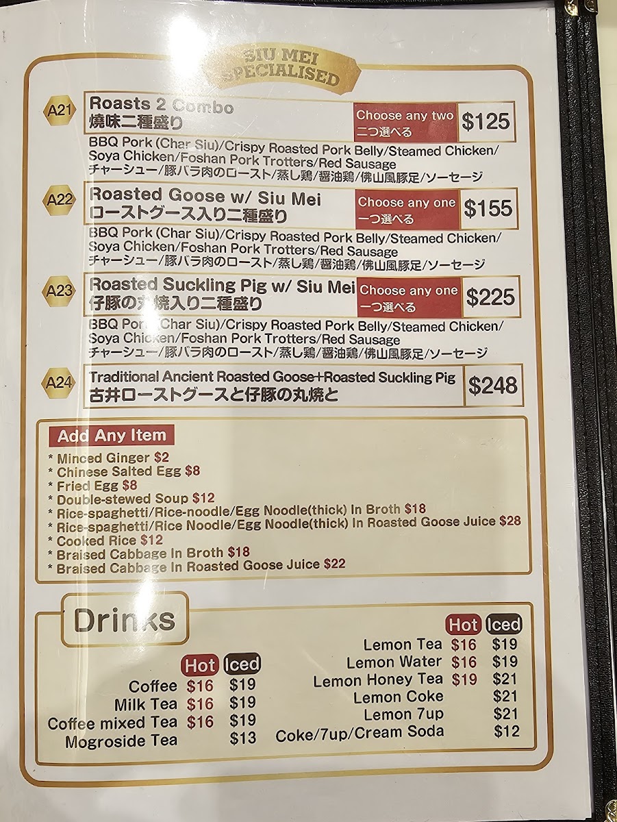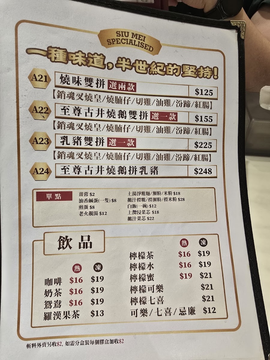 “ Went there around 3pm. Ordered the tea time set. Roast Goose and Char Siew/Roast Pork for HK$49 each and soup HK$6. Goose skin was crispy, meat tender. Roast pork had crackling skin and fat practically melts in the mouth. One of the best I’ve tried and reasonable prices too. Will visit again. ”